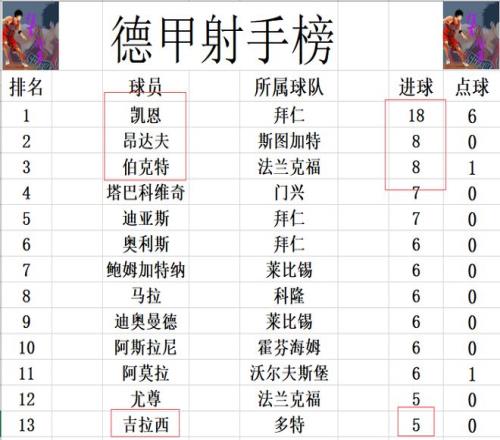 射手榜方面,凱恩18球高居榜首,已經(jīng)領(lǐng)先第2的昂達(dá)夫,伯克特10球之多。迪亞斯,塔巴科維奇7球并列第4,吉拉西今天進(jìn)球被吹掉,無(wú)緣追上鮑姆加特納,阿莫拉等人,還是差1球才能擠入前十。 |