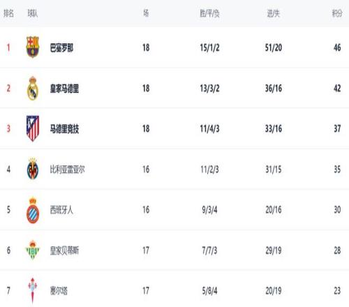 在積分榜上,巴薩以46分排名榜首。第2名的是皇馬,戰(zhàn)績是42分。前2的差距只有4分,巴薩占據(jù)優(yōu)勢。馬競贏球之后,總積分是37分,比巴薩少了9分,沖擊冠軍希望比較渺茫。比利亞雷亞爾依然是35分,排名第4。第5的是西班牙人,拿到30分?;始邑惖偎挂?8分排名第6。 |