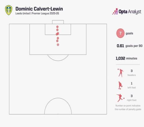 賽后Opta對卡爾弗特-勒溫本賽季的英超進(jìn)球進(jìn)行了分析,賽季至今這名英格蘭前鋒代表利茲聯(lián)在英超出場15次,其中11次首發(fā),打進(jìn)7球,合計出場時間1032分鐘,平均每90分鐘打進(jìn)0.61球。