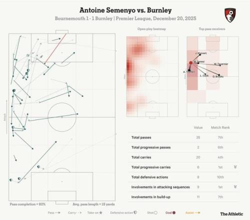 當(dāng)比賽進(jìn)行到下半場(chǎng)中段,伯恩茅斯迎來了當(dāng)天下午第12次打破僵局的機(jī)會(huì),對(duì)手是伯恩利。 喬什-勞倫特在禁區(qū)邊緣解圍時(shí)腳下一滑,皮球滾到了塞門約腳下,他果斷將球掃射入網(wǎng),幫助球隊(duì)取得1-0領(lǐng)先。此時(shí)活力球場(chǎng)的歡呼聲不僅是喜悅,更夾雜著如釋重負(fù)的情緒。 這是塞門約本賽季的第8個(gè)聯(lián)賽進(jìn)球,也是他在經(jīng)歷連續(xù)7場(chǎng)進(jìn)球荒后,連續(xù)第二場(chǎng)取得進(jìn)球。再加上3次助攻,他已經(jīng)直接參與了伯恩茅斯本賽季26個(gè)英超進(jìn)球中的11個(gè),占比達(dá)到42%。在英超中,只有曼城的哈蘭德(56%)以及布倫特福德的伊戈?duì)?蒂亞戈(46%)在球隊(duì)進(jìn)球中的占比更高。 伯恩茅斯主帥伊勞拉在賽后評(píng)價(jià)這場(chǎng)最終1-1戰(zhàn)平伯恩利的比賽時(shí)說道:“(塞門約)對(duì)我們來說非常重要。他不僅在數(shù)據(jù)層面幫助球隊(duì),在很多方面都貢獻(xiàn)巨大。我認(rèn)為他一直非常穩(wěn)定,跑位也在不斷進(jìn)步。即便最近那段時(shí)間沒有進(jìn)球,他依然非常有威脅。” 伊勞拉的這番話,是在回應(yīng)有關(guān)塞門約未來去向的問題。 The Athletic記者大衛(wèi)-奧恩斯坦上月報(bào)道稱,這位加納國腳的合同中包含一條6500萬英鎊(約合8700萬美元)的解約金條款,該條款可在即將到來的冬季轉(zhuǎn)會(huì)窗口被激活。明年夏天解約金數(shù)額將下降,但即便如此,伯恩茅斯仍能獲得可觀利潤——畢竟他們是在2023年1月以僅1050萬英鎊的價(jià)格從布里斯托爾城簽下他的。 伊勞拉為優(yōu)秀球員提供成長平臺(tái)的能力,毫無疑問是塞門約能夠打出高水平表現(xiàn)的重要因素。但問題在于:這位25歲的前鋒究竟是因?yàn)椴髅┧沟捏w系而大放異彩,還是他的個(gè)人能力足以讓他在其他環(huán)境中同樣制造威脅? 從下面的球員數(shù)據(jù)面板可以看出,在周六對(duì)陣伯恩利的比賽中,塞門約幾乎參與了伯恩茅斯前場(chǎng)的所有進(jìn)攻組織。
