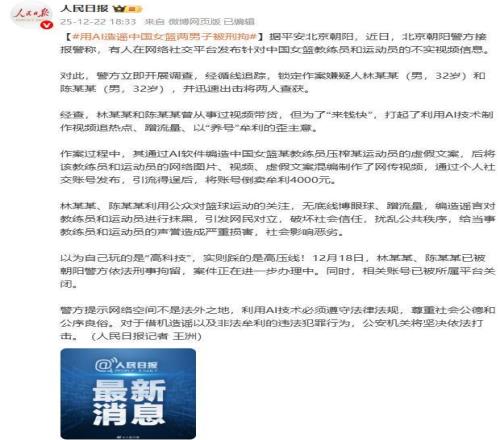 結(jié)語(yǔ) 說(shuō)到底,我們關(guān)注體育、喜歡運(yùn)動(dòng)員,愛(ài)的是他們?yōu)閲?guó)爭(zhēng)光的熱血,是突破自我的堅(jiān)韌。 別讓流量鐮刀收割了我們的情緒,更別讓無(wú)端的謠言傷害到那些真正在賽場(chǎng)上付出的人,守護(hù)好體育圈的純粹,用理性和尊重為運(yùn)動(dòng)員護(hù)航,才是作為觀眾最該做的事。 信息來(lái)源:原文登載于央視新聞2025年12月22日關(guān)于“利用AI造謠“中國(guó)女籃”兩男子被刑拘”的報(bào)道