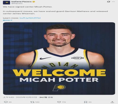 北京時間12月27日,步行者122-140不敵凱爾特人。賽前步行者宣布:球隊(duì)正式簽約中鋒米卡-波特。為了給米卡-波特騰位置,步行者不僅裁掉了后衛(wèi)加里森-馬修斯,還跟中鋒詹姆斯-懷斯曼解約。12月20日,步行者剛簽下懷斯曼。