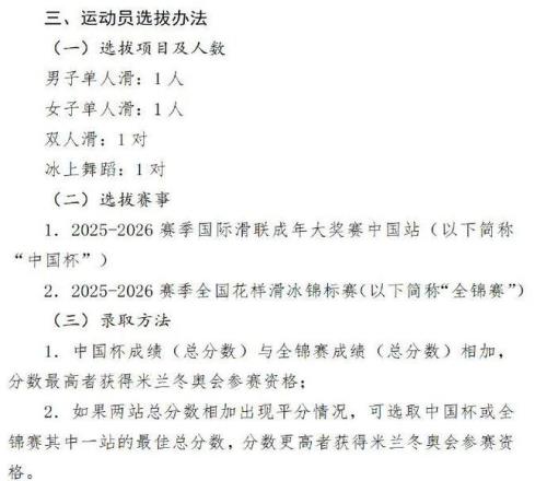 按照國家體育總局冬季運動管理中心10月公布的《花樣滑冰項目米蘭冬奧會參賽選拔辦法》,本賽季國際滑聯(lián)花樣滑冰大獎賽中國杯和全國花樣滑冰錦標(biāo)賽兩次比賽的總分將作為米蘭冬奧會參賽選手的選拔依據(jù)。因此在全錦賽結(jié)束后,中國花樣滑冰隊出征米蘭冬奧會的名單將全部產(chǎn)生。