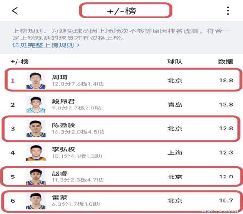 眾所周知,球員場上的正負(fù)值,直接反映出球員在攻防兩端的作用和效率,以及與球隊的融入度、化學(xué)反應(yīng)等。北京首鋼男籃有4名本土球員,排在正負(fù)值榜前6,足以說明,這支球隊的即戰(zhàn)力和整體實力,是多么的強(qiáng)大無比。