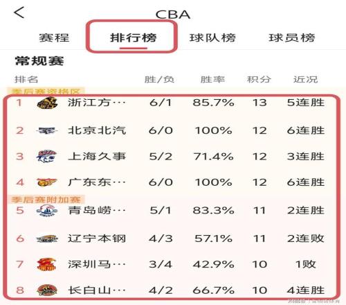 截止目前,北京首鋼和廣東男籃,同為6勝0負(fù)成績,由于廣廈和上海多賽一輪,故廣廈男籃以6勝1負(fù),排積分榜第一位;北京首鋼以6勝0負(fù),排積分榜第二位;上海隊以5勝2負(fù),排積分榜第三位;廣東隊以6勝0負(fù),排積分榜第四位;青島隊以5勝1負(fù),排積分榜第五位;遼寧隊以4勝3負(fù),排積分榜第六位;深圳隊以3勝4負(fù),排積分榜第七位;吉林隊以4勝2負(fù),排積分榜第八位。