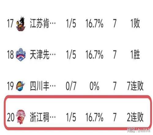 目前,排在積分榜后四位的,分別是江蘇隊1勝5負(fù),排積分榜倒數(shù)第四位;天津隊以1勝5負(fù),排積分榜倒數(shù)第三位;四川隊以0勝7負(fù),排積分榜倒數(shù)第二位;浙江隊以1勝6負(fù),排積分榜倒數(shù)第一位。浙江隊開賽至今,僅僅擊敗福建隊,先后不敵遼寧、廣東、寧波(雙殺)、北京、上海隊,與球隊賽季前的預(yù)期目標(biāo)相去甚遠(yuǎn)。