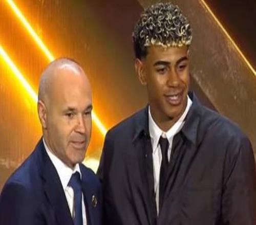 頒獎典禮上,亞馬爾獲得了2025年度西甲最佳U23球員獎,巴薩傳奇伊涅斯塔親自為亞馬爾頒發(fā)了獎杯。