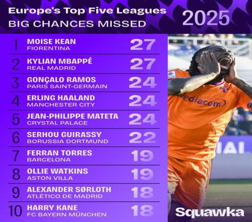 北京時間1月1日,知名數(shù)據(jù)機(jī)構(gòu)Squawka統(tǒng)計(jì)出了2025年歐洲五大聯(lián)賽錯失絕佳機(jī)會次數(shù)最多的10名球員,莫伊塞-基恩和姆巴佩同以27次并列第一,哈蘭德24次并列第二,哈里-凱恩上榜。