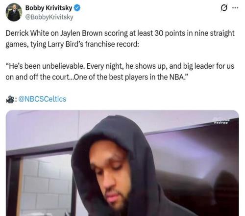 更為夸張的是,杰倫布朗的表現(xiàn)還呈現(xiàn)出明顯的上升勢頭,12月份場均可以轟下同期聯(lián)盟第一的32.9分,一度連續(xù)9場轟下30分表現(xiàn),追平傳奇巨星拉里伯德保持的隊史紀錄。 正如懷特采訪中所說:“他的表現(xiàn)難以置信,每一場比賽都能挺身而出,無論是在場上,還是在場下,他都是我們的領(lǐng)袖,也是NBA最好的球員之一。”