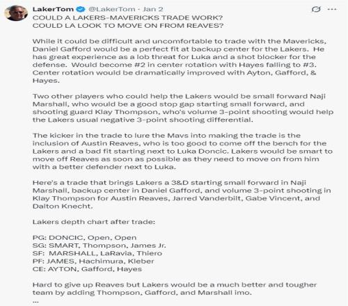 北京時間1月2日晚,湖媒Laker Tom再度為佩林卡建言獻(xiàn)策,他覺得不該放棄這個賽季,他認(rèn)為湖人可以交易奧斯汀-里夫斯這位準(zhǔn)全明星后衛(wèi),獨(dú)行俠正在考慮以弗拉格重建,里夫斯是一個不錯的籌碼。 他認(rèn)為加福德就是湖人內(nèi)線最需要的防守球員+運(yùn)動能力,他跟東契奇有著默契的配合,他的護(hù)框能力、協(xié)防能力都有目共睹,他可以成為艾頓的替補(bǔ),海斯成為第三中鋒的后補(bǔ); 小前鋒馬紹爾甚至可以作為湖人的先發(fā)三號位,八村壘根本不適合打三號位,他的防守腳步很差,缺乏防守智慧,馬紹爾的三分球能力也可以彌補(bǔ)湖人三分球方面的不足; 克萊-湯普森雖然生涯已經(jīng)進(jìn)入末期,但他仍有一手不錯的三分球,他可以在替補(bǔ)席為湖人拉開空間,他很適合搭檔詹姆斯帶領(lǐng)的第二陣容。