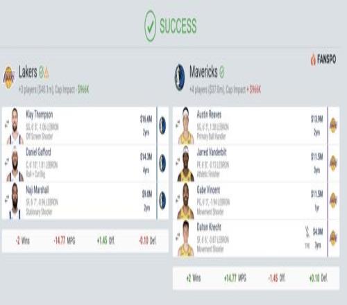 湖媒模擬的這套方案: 湖人得到克萊-湯普森、丹尼爾-加福德、納吉-馬紹爾; 獨(dú)行俠得到:奧斯汀-里夫斯、賈里德-范德比爾特、蓋布-文森特、道爾頓-克內(nèi)克特;