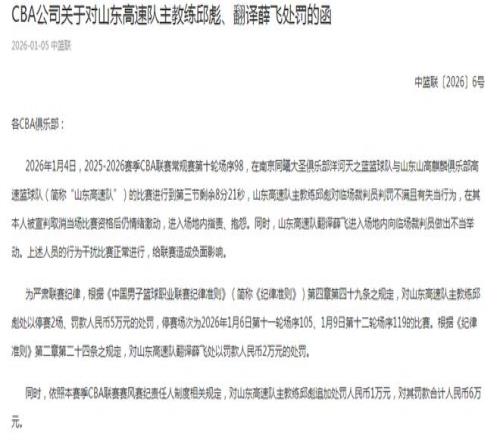 為嚴(yán)肅聯(lián)賽紀(jì)律,根據(jù)《中國男子籃球職業(yè)聯(lián)賽紀(jì)律準(zhǔn)則》第四章第四十九條之規(guī)定,對山東高速隊(duì)主教練邱彪處以停賽2場、罰款5萬元的處罰,停賽場次為2026年1月6日第十一輪場序105、1月9日第十二輪場序119的比賽。根據(jù)《紀(jì)律準(zhǔn)則》第二章第二十四條之規(guī)定,對山東高速隊(duì)翻譯薛飛處以罰款2萬元的處罰。 同時(shí),依照本賽季CBA聯(lián)賽賽風(fēng)賽紀(jì)責(zé)任人制度相關(guān)規(guī)定,對山東高速隊(duì)主教練邱彪追加處罰1萬元,對其罰款合計(jì)6萬元。 以上人員罰款的繳納按照《紀(jì)律準(zhǔn)則》第一章第十三條之規(guī)定辦理。 特此函告。 |