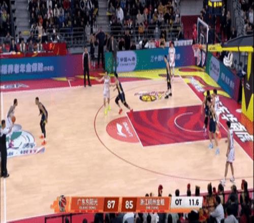 場面處于落后,但廣東隊沒有放棄,還是靠防守,利用全場緊逼連造浙江2次失誤,徐杰王少杰艱難制造4罰追回3分,37.8秒,陳家政命中踩線三分助力廣東扳平。