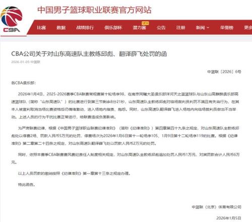 各CBA俱樂(lè)部: 2026年1月4日,2025-2026賽季CBA聯(lián)賽常規(guī)賽第十輪場(chǎng)序98,在南京同曦大圣俱樂(lè)部洋河天之藍(lán)籃球隊(duì)與山東山高麒麟俱樂(lè)部高速籃球隊(duì)(簡(jiǎn)稱(chēng)“山東高速隊(duì)”)的比賽進(jìn)行到第三節(jié)剩余8分21秒,山東高速隊(duì)主教練邱彪對(duì)臨場(chǎng)裁判員判罰不滿(mǎn)且有失當(dāng)行為,在其本人被宣判取消當(dāng)場(chǎng)比賽資格后仍情緒激動(dòng),進(jìn)入場(chǎng)地內(nèi)指責(zé)、抱怨。同時(shí),山東高速隊(duì)翻譯薛飛進(jìn)入場(chǎng)地內(nèi)向臨場(chǎng)裁判員做出不當(dāng)舉動(dòng)。上述人員的行為干擾比賽正常進(jìn)行,給聯(lián)賽造成負(fù)面影響。 為嚴(yán)肅聯(lián)賽紀(jì)律,根據(jù)《中國(guó)男子籃球職業(yè)聯(lián)賽紀(jì)律準(zhǔn)則》(簡(jiǎn)稱(chēng)《紀(jì)律準(zhǔn)則》)第四章第四十九條之規(guī)定,對(duì)山東高速隊(duì)主教練邱彪處以停賽2場(chǎng)、罰款人民幣5萬(wàn)元的處罰,停賽場(chǎng)次為2026年1月6日第十一輪場(chǎng)序105、1月9日第十二輪場(chǎng)序119的比賽。根據(jù)《紀(jì)律準(zhǔn)則》第二章第二十四條之規(guī)定,對(duì)山東高速隊(duì)翻譯薛飛處以罰款人民幣2萬(wàn)元的處罰。 同時(shí),依照本賽季CBA聯(lián)賽賽風(fēng)賽紀(jì)責(zé)任人制度相關(guān)規(guī)定,對(duì)山東高速隊(duì)主教練邱彪追加處罰人民幣1萬(wàn)元,對(duì)其罰款合計(jì)人民幣6萬(wàn)元。 以上人員罰款的繳納按照《紀(jì)律準(zhǔn)則》第一章第十三條之規(guī)定辦理。 特此函告。 中籃聯(lián)(北京)體育有限公司 2026年1月5日