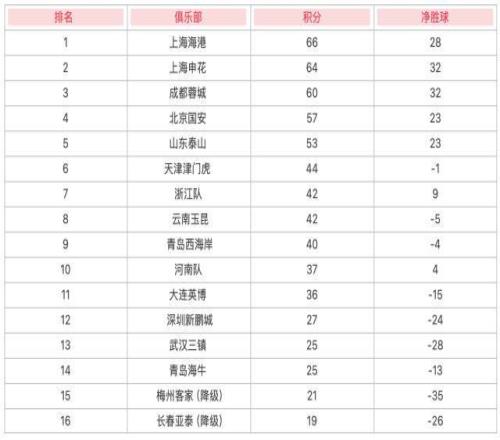 中超30輪積分榜:海港積66分奪冠梅州亞泰降級