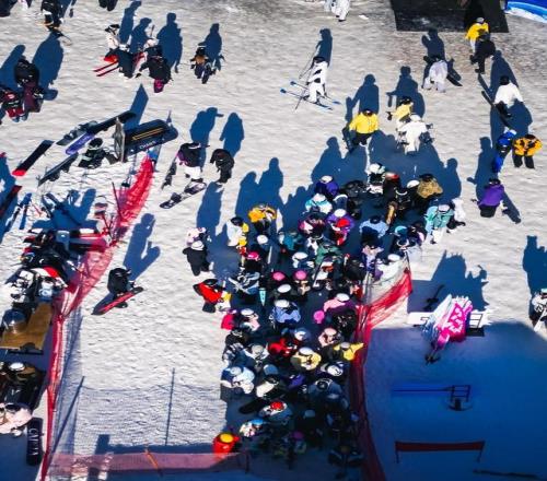 11月22日,滑雪愛好者在吉林市中旅松花湖度假區(qū)排隊(duì)乘坐纜車(無人機(jī)照片)。 新華社記者 許暢 攝