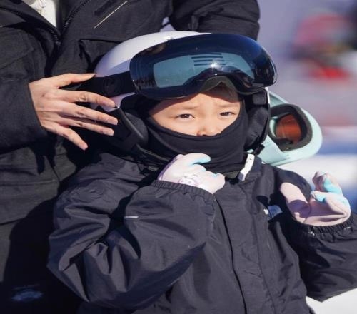 11月22日,小朋友在吉林市中旅松花湖度假區(qū)滑雪前佩戴雪鏡。 新華社記者 顏麟蘊(yùn) 攝
