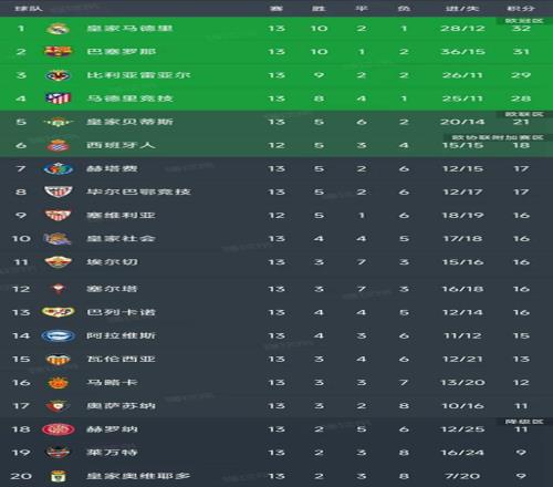 隨著皇馬22埃爾切,西甲第13輪最新積分榜如下,巴薩落后皇馬1分