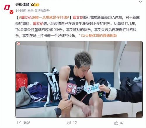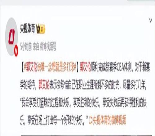 02、央視發(fā)文 11月24日,央視體育以“郭艾倫說唯一念想就是多打球”為題。 發(fā)布了他在CBA體測現場的采訪視頻,讓我們看到了他最真實的狀態(tài)。