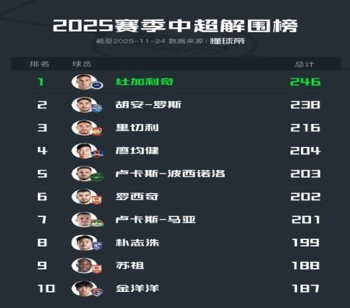 2025中超解圍榜:杜加利奇以246次居首本土球員廖均健最多