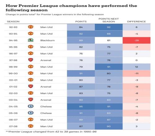 過去15個(gè)賽季里,自2010-11賽季安切洛蒂執(zhí)教的切爾西開始,衛(wèi)冕冠軍球隊(duì)的積分較上一賽季下滑至少10分的情況出現(xiàn)了9次。 其中6次的積分降幅更是達(dá)到20分及以上,分別是2013-14賽季弗格森退休后的曼聯(lián)、2015-16賽季的切爾西、2016-17賽季的萊斯特城、2017-18賽季的切爾西、2020-21賽季的利物浦,以及上一賽季的曼城。而2015-16賽季的切爾西和2016-17賽季的萊斯特城,積分更是暴跌了37分。