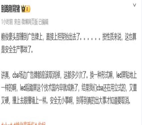 賽后媒體人“別跑剛背豬”表示,賴俊豪頭部撞到廣告牌上,直接上擔(dān)架抬出去了,按性質(zhì)來(lái)說(shuō),這也算是安全生產(chǎn)事故了。講真,cba場(chǎng)邊廣告牌都應(yīng)該取消掉,這都多少次了。換一種形式嘛,led屏貼地上一樣的啊,led踩踏屏這個(gè)技術(shù)國(guó)內(nèi)早就成熟了,結(jié)果我們cba還在用立式的,又重又硬,撞上去跟撞墻上一樣。安全無(wú)小事啊,別等到真的出大事才知道要取消。