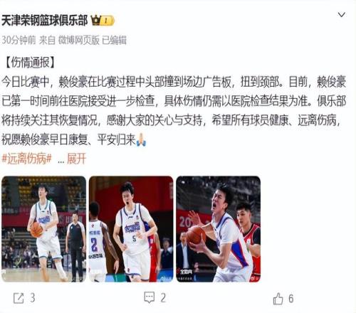 天津男籃官方第一時(shí)間發(fā)布了傷情公告,賴俊豪在比賽過(guò)程中頭部撞到場(chǎng)邊廣告板,扭到頸部,具體傷情仍需以醫(yī)院檢查為準(zhǔn)。
