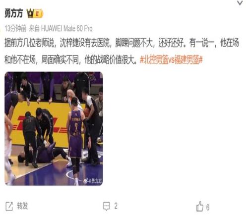 那么說(shuō),沈梓捷的傷情嚴(yán)不嚴(yán)重?賽后第一時(shí)間,媒體人勇方方更新的報(bào)道,好消息是,沈梓捷沒(méi)有去醫(yī)院,腳踝問(wèn)題不大。